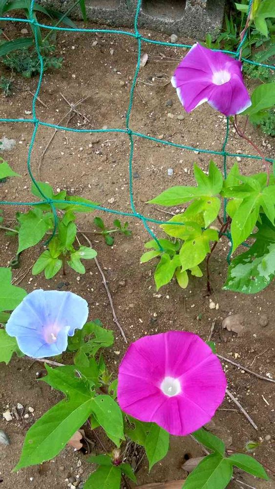 こぼれ種の朝顔がネットにからまず咲いています😅