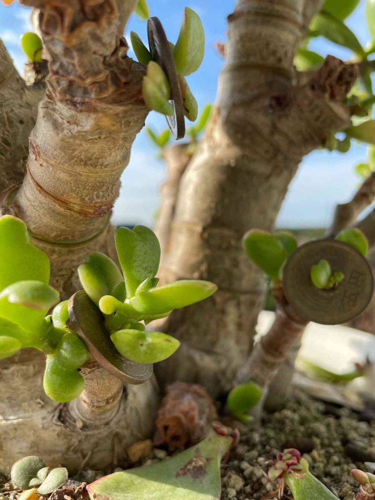 金のなる木、エアコン前に置いて駄目にしてしまい新たな新芽に5円玉、初めての挑戦です🌱😅