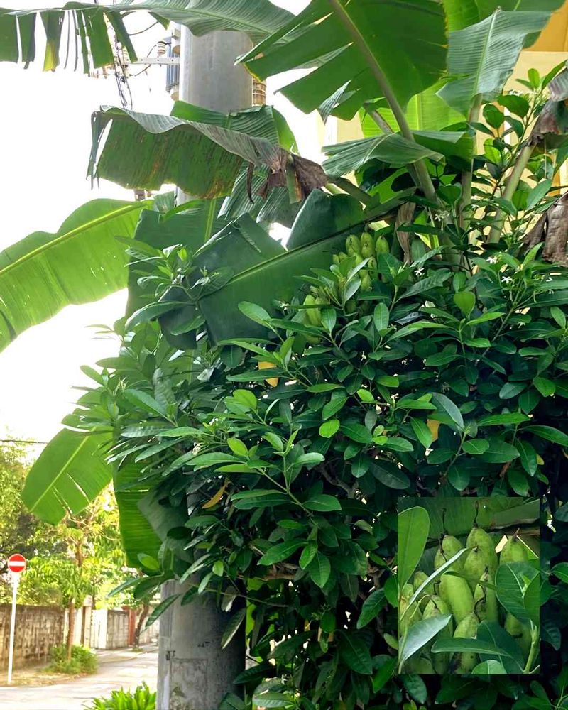 手前の木(ジャスミン❓)に隠れて見えにくいけど、見えるかな?画像右下に拡大してみました🍌🍌🍌