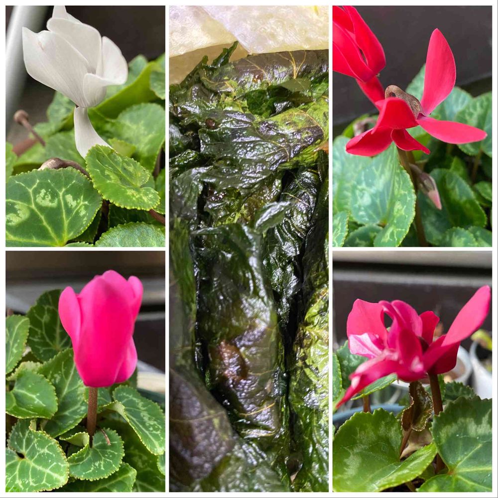 シクラメン 白🤍と真っ赤❤️のシクラメンは ガーデンシクラメンで一緒の鉢ですが 葉っぱ🌿も立派ですし 花芽が15くらい付いてます