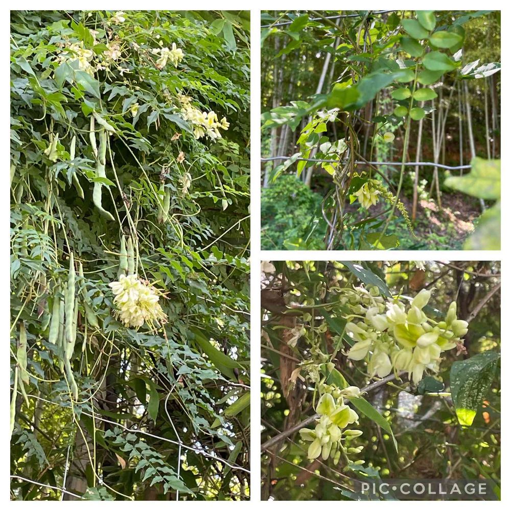 山すその歩道を歩いていて見つけました👀お花はクリーム色がかった白色。インゲン豆のような実もぶら下がっていました🌿