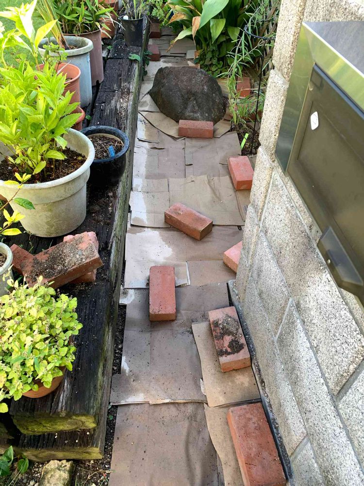 YouTubeで見た、段ボールマルチをやってみようと段ボールを敷き詰めてみました。