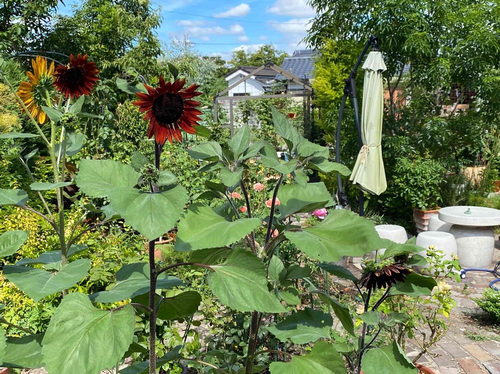 黒っぽく見えるけど赤いひまわり、クラレットさんが、どんどん開いて夏らしいお庭になってまいりました😊