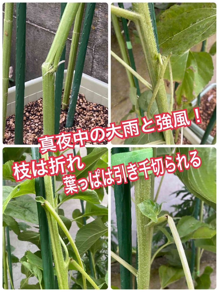 今日、仕事から帰って見たら、予想以上に葉っぱもかなり折れてて、凄い事になってたよ💦