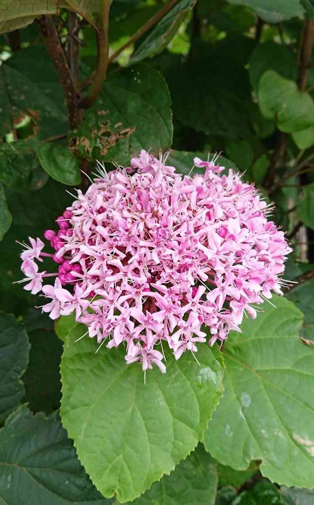 シソ科クサギ属の落葉低木。中国南部原産で観賞用に栽培されるほか、野生化したものも見られる。地下茎で繁殖する。葉は丸みがあって茎に向かい合って付き、長さ8~20㎝ほどと大きめで、縁に鋸歯がある。花期は7~8月。ピンク色の筒状の小さな花が半球形に集まって枝先につく。花冠の先は5裂し、雄しべが長く突き出て目立つ。花には芳香がある。