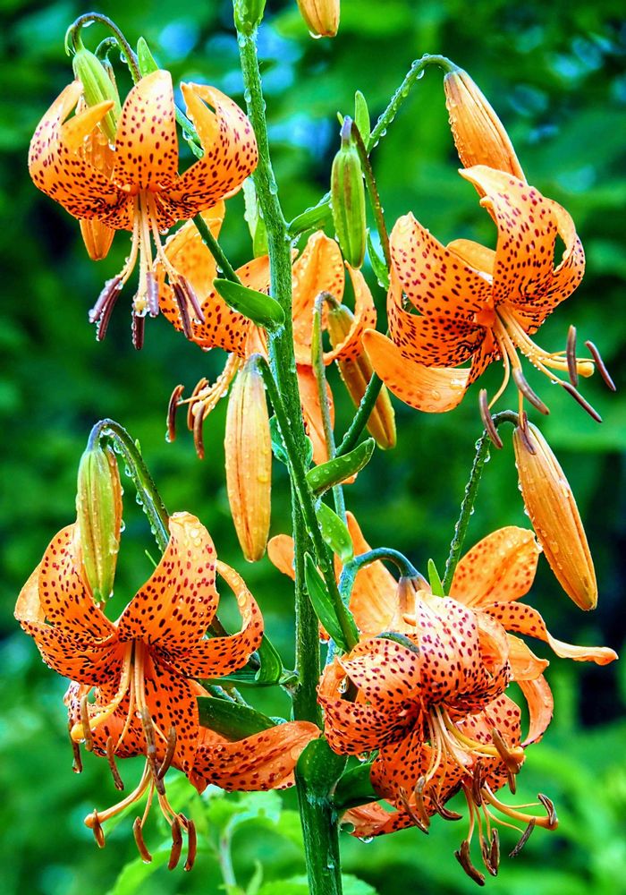 雨粒が覆って、花弁のオレンジ色で斑点模様が、更に鮮やかに見えるようです。