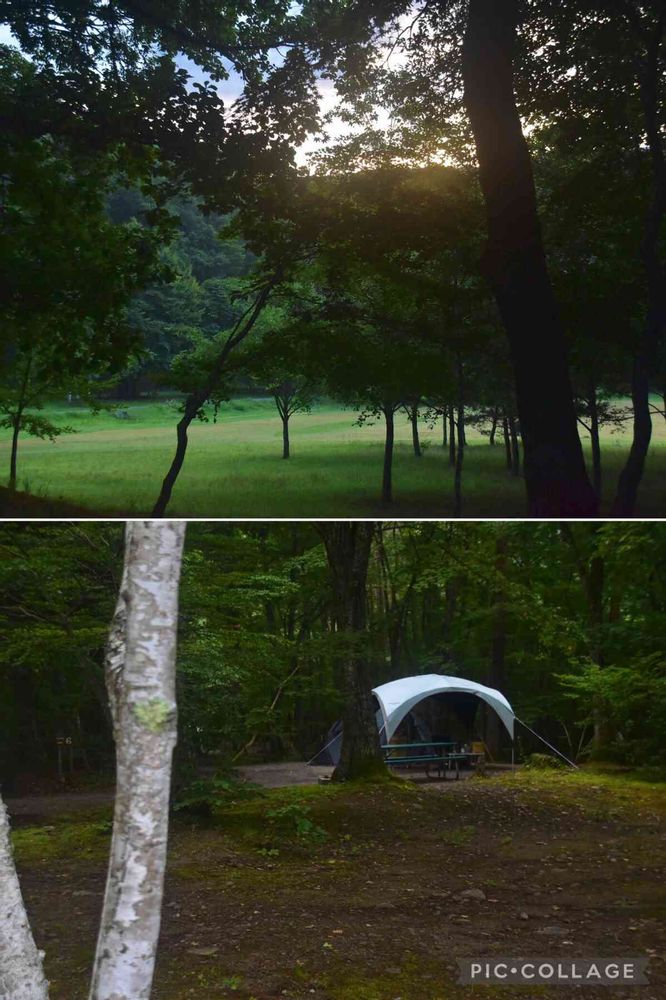 樹々に囲まれたキャンプサイト、陽が上がってきました☀️