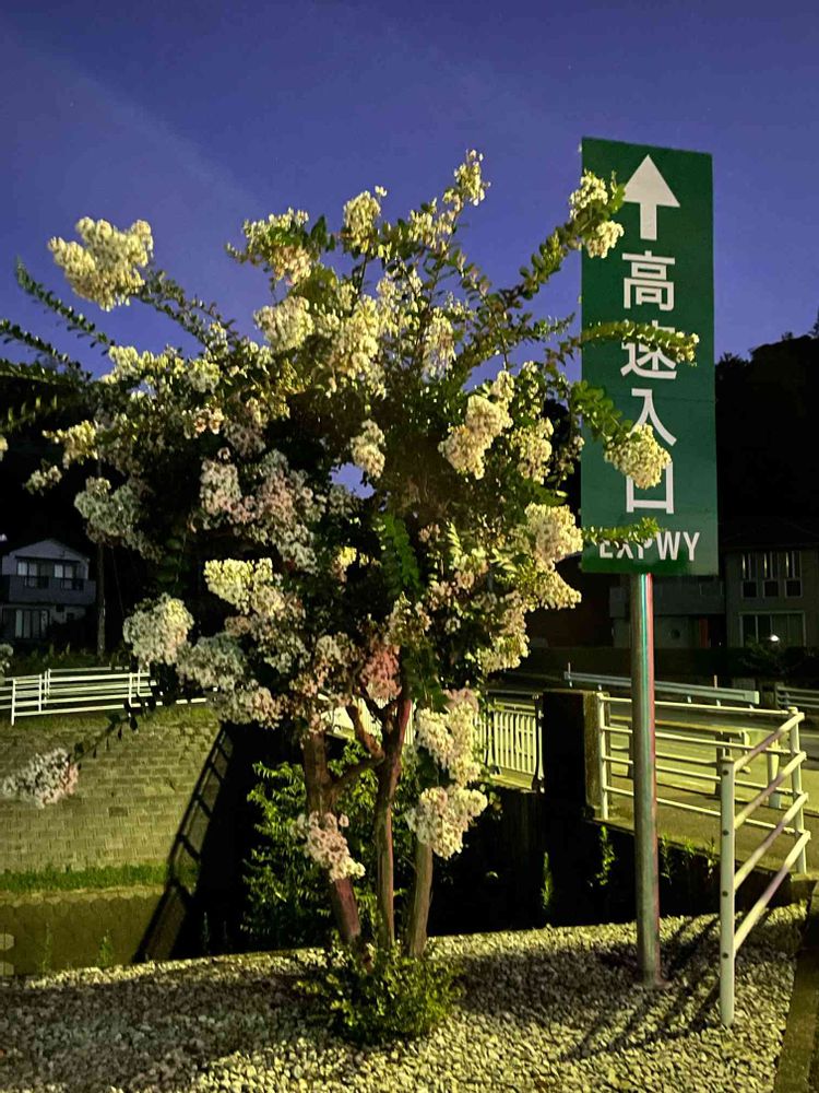 *この写真画像では、白色のサルスベリの花に色が付いたりしていますが、これは交差点の照明や信号機🚦の点灯具合の光線によってこのようになっています。
