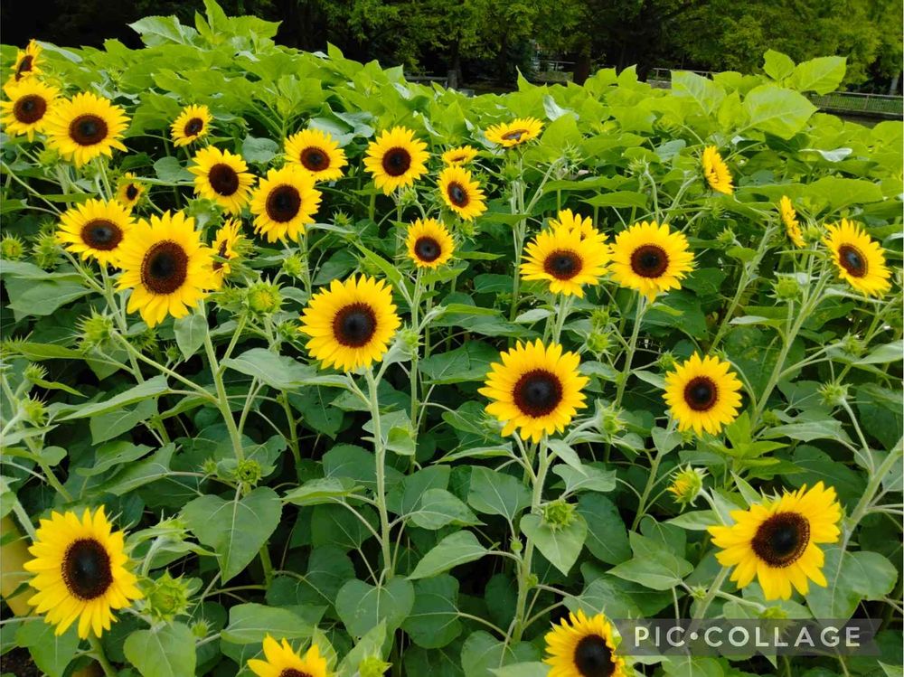 さて、6月上旬に種を蒔いていた公園の花壇は、2ヶ月弱でヒマワリのお花畑になりました🌻🌻🌻✨花壇の向こうは噴水もある池になっていて、憩いの場です😊💙私の他にもヒマワリの撮影をしてる方がいてホッコリしました😊