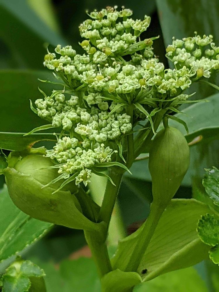 父から一昨年分けてもらった明日葉が初めて花咲いた。花咲くのね。知らなかった。しかもここまで成って初めて花に気づいた