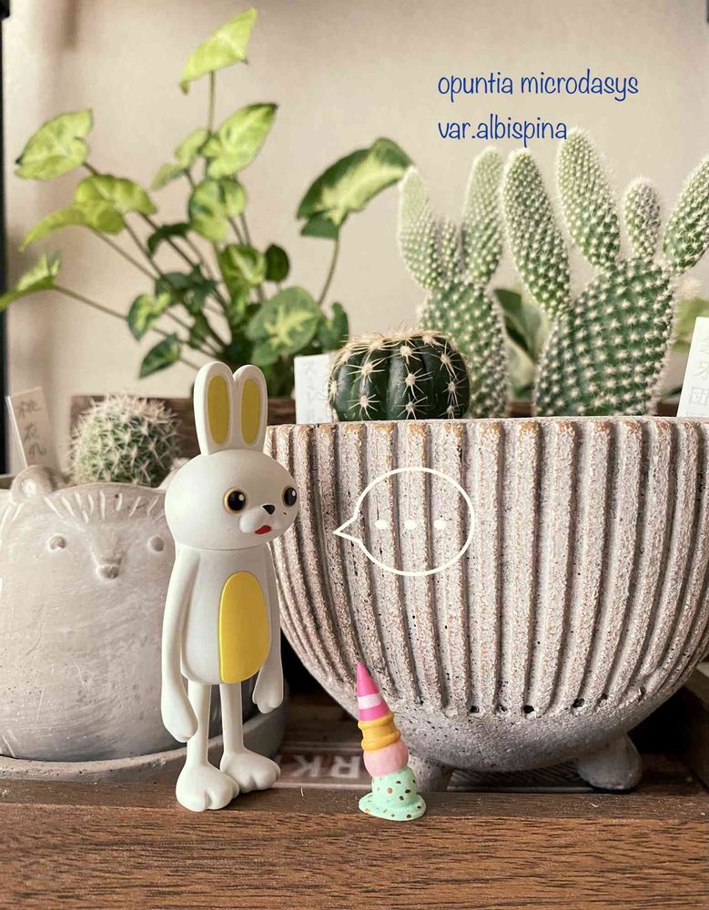 かわいい鉢にお住まいの象牙団扇(?)さんですね。バニーカクタスでもなく、団扇サボテンでもないんですね。私は、はじめてです。
