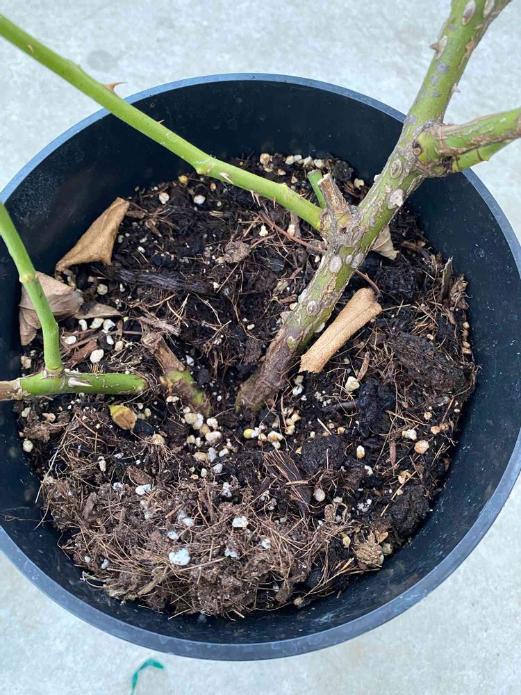 購入した苗にはデルバールアレゴリーのタグがつけられていましたが、ちょー深植えで挿木かと思うほど…コメリの他の店舗でコメリブランドの苗を見ていて、ハッ!として家に帰り確認したら、家にあるコメリブランドのチッペンデールと同じ鉢でした。
