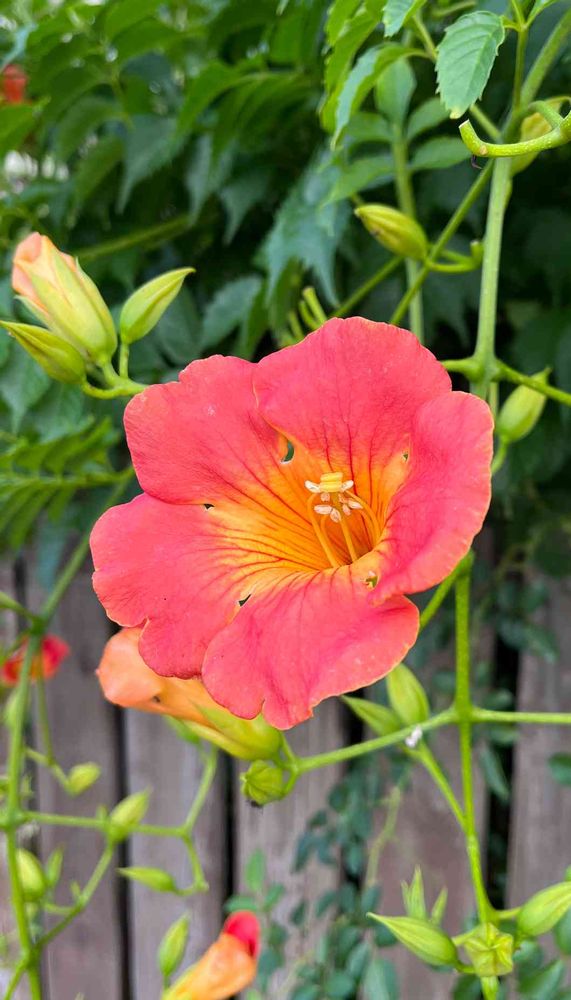 ノウゼンカズラ、やっと見つけた可愛らしい色で咲いていました。まだまだ蕾もありました。