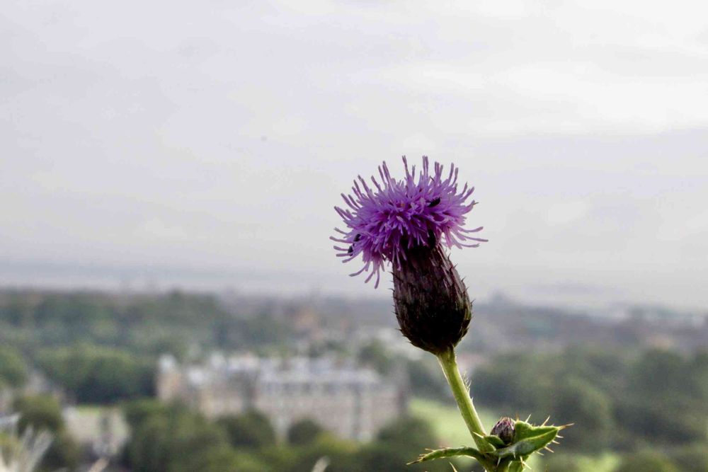 今日のお花アザミ再掲。遠くにはエリザベス女王のスコットランドでのお住まいホリルード宮殿。