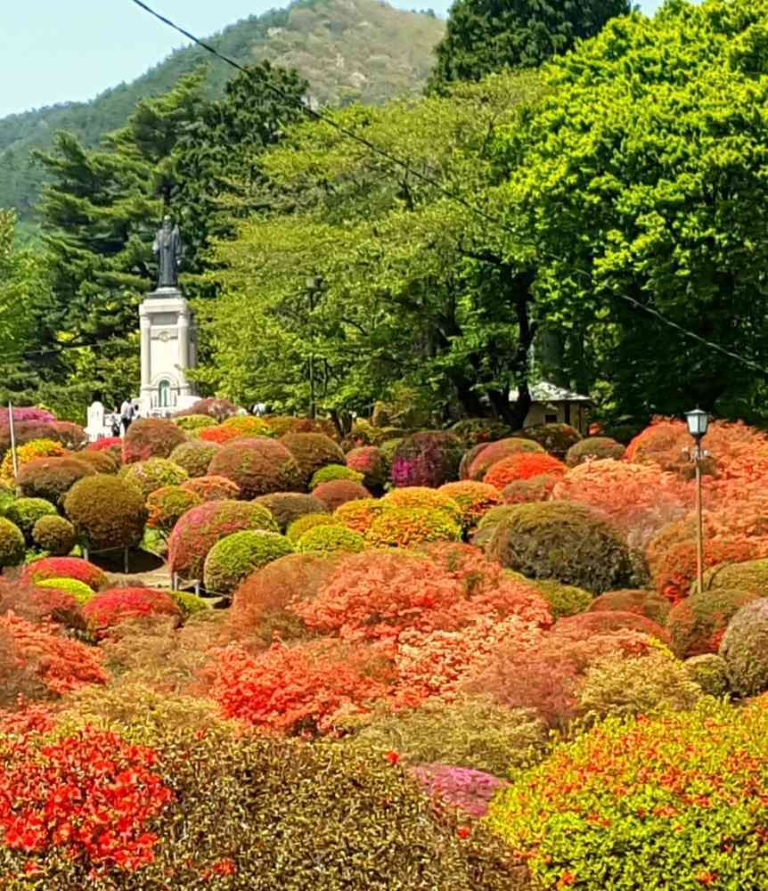 丸く可愛く刈り込まれた約30種類3万株のツツジがところ狭しと植えられている、なだらかな山の斜面にある公園です🌼
