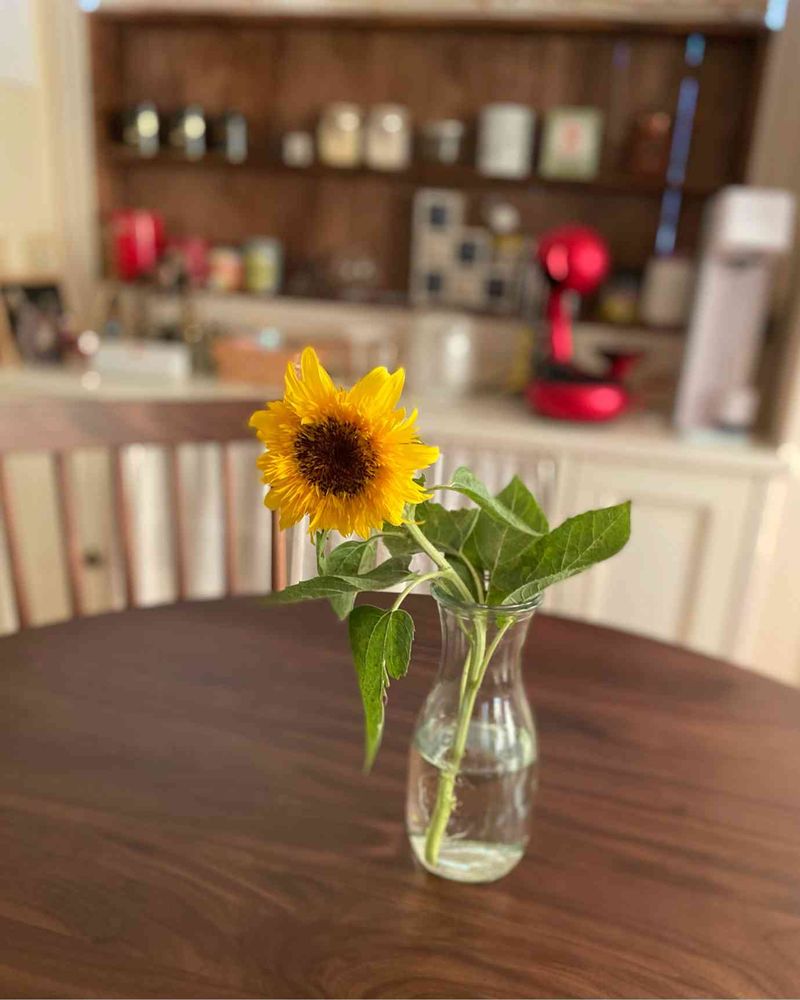 花を飾るとすぐ🐈に齧られちゃうんだけど、さすがにヒマワリは硬いのか無事です😁