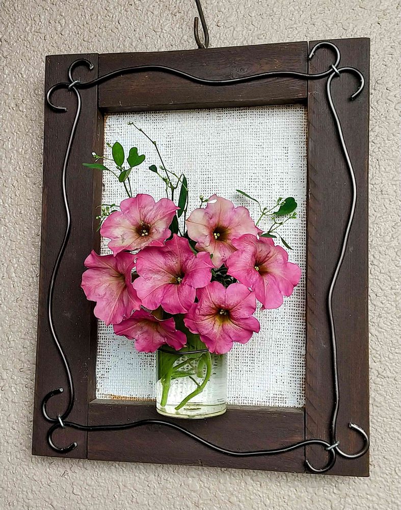 これは額の背板に穴を開けてワイヤーを通し、輪っかを作って花瓶を固定しています。