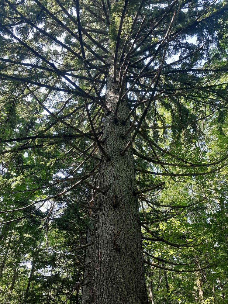 推定樹齢250年のエゾマツです。天然のエゾマツは土の上で発芽してもうまく育たず、朽ちた倒木の上で発芽して新たなエゾマツが成長するのだそうです。
