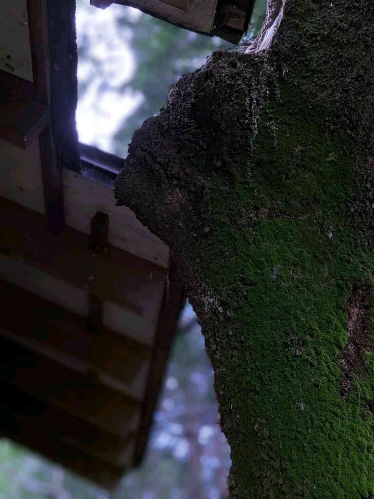 15年ほど前この小屋を作ってもらった時 この幹は小屋の屋根にかかっていなかったのですが そのうち小屋の屋根を切り取ってもらい かなり太かった枝も落としてもらい 先日は遂にエノキの方を少し削ってもらいました