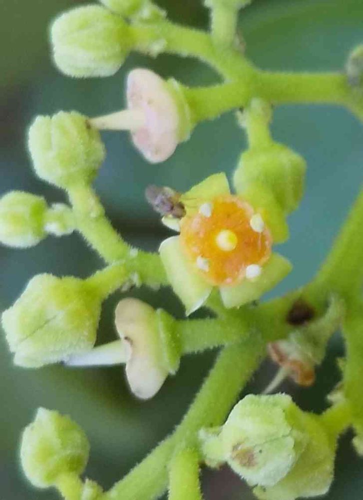 緑色は蕾。 オレンジ色のお花に 4本の雄しべと 中央に雌しべが 見えます。やがて ピンク色へ変化します。