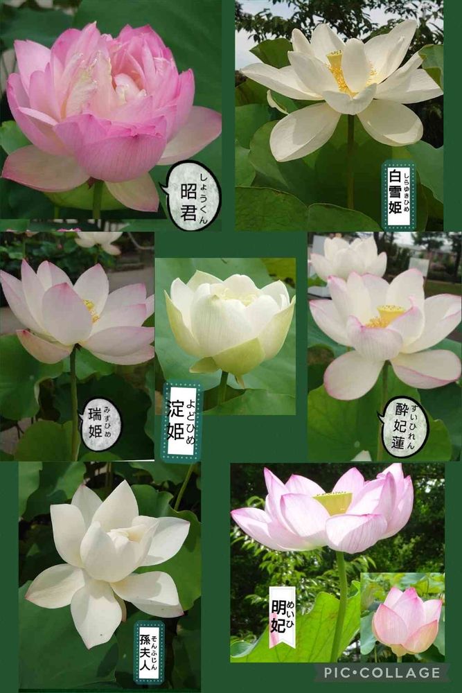 ①の美女繋がりで、美人の名前が付けられた蓮の花たちをコラージュしました。