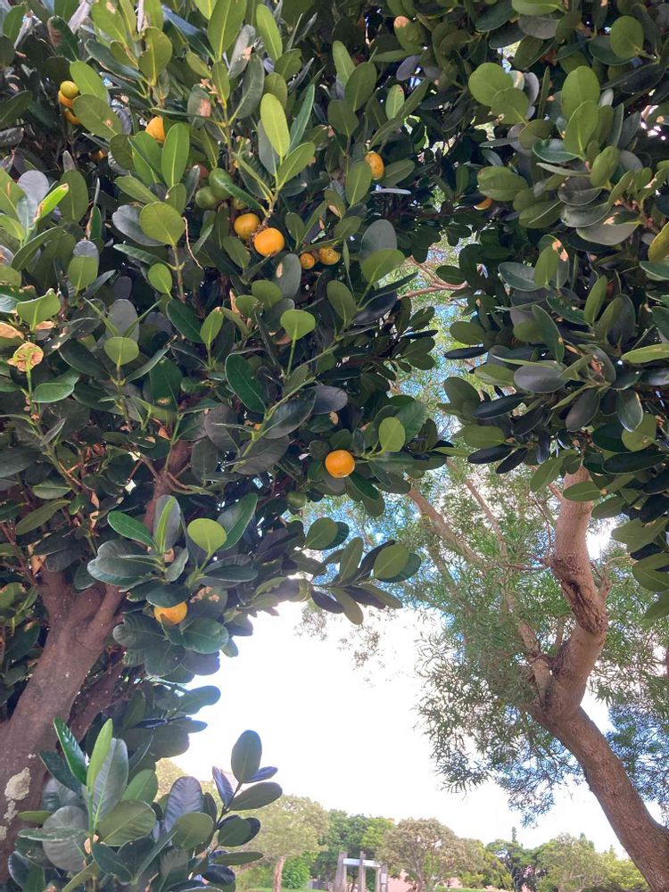 5月に白いお花満開だった(5/12投稿)フクギの木にオレンジ色の実がたくさんつき始めました🟠🟠🟠 美味しそうに見えるけど、食べてる人見たことなく、道にいっぱい落ちてます😜