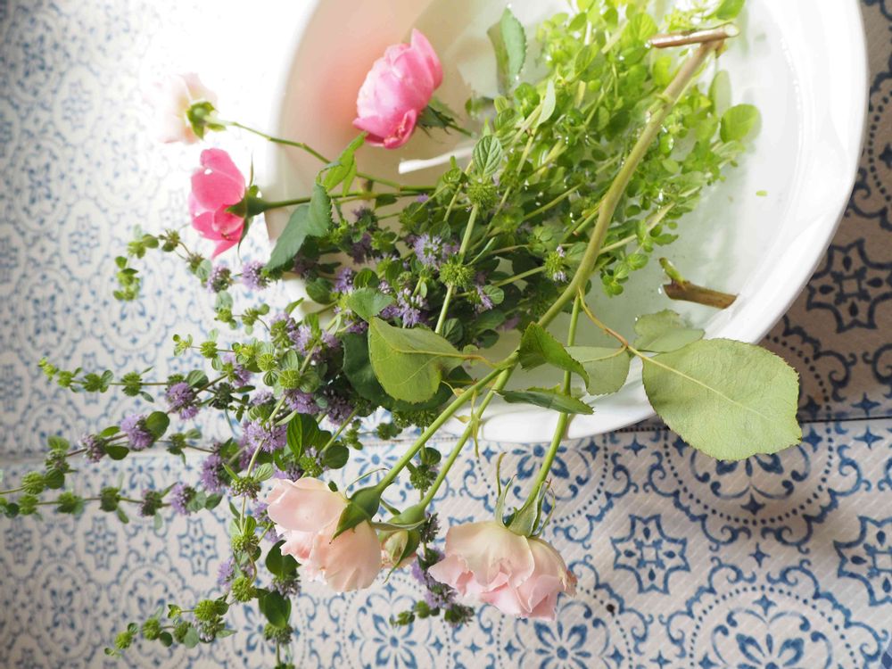 いっしょにペニーロイヤルミントがわさわさになってしまったので剪定し、一部を一緒に飾ろうと水につけておきました。