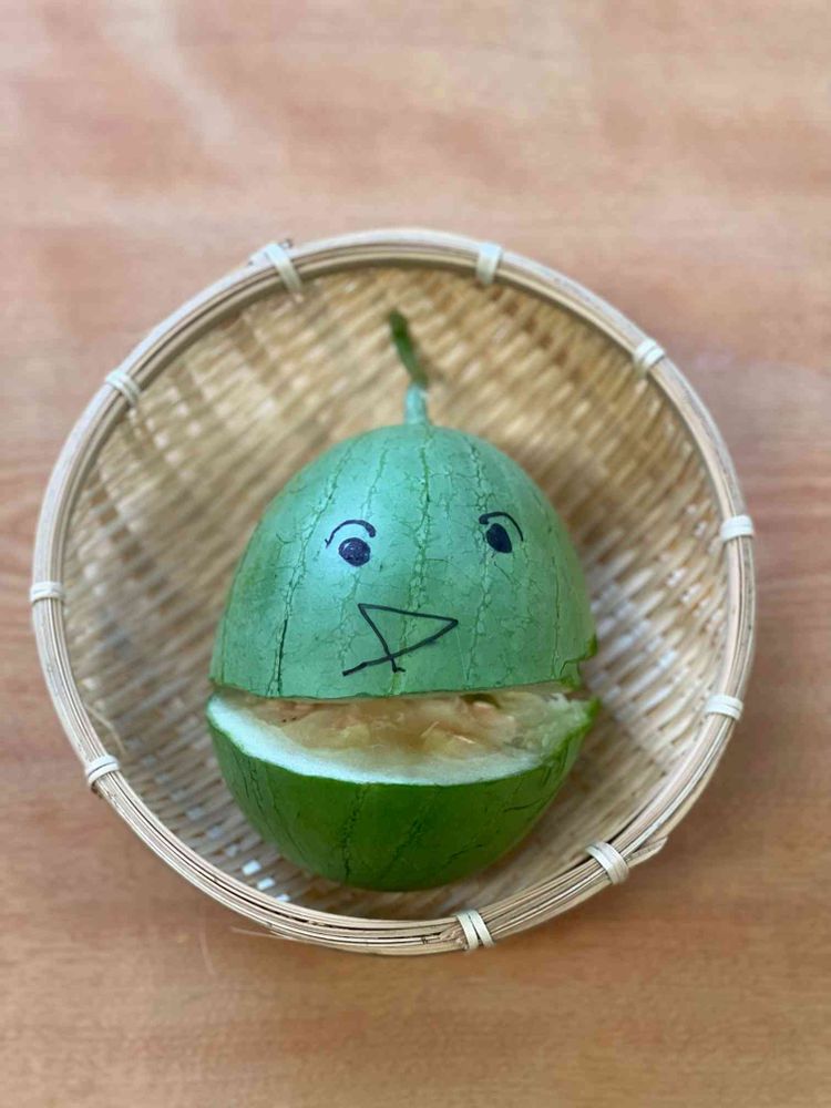 仕方がないので、勤務先の子どもに顔を描いてもらい、ハロウィンカボチャっぽいスイカに変身🎃🍉