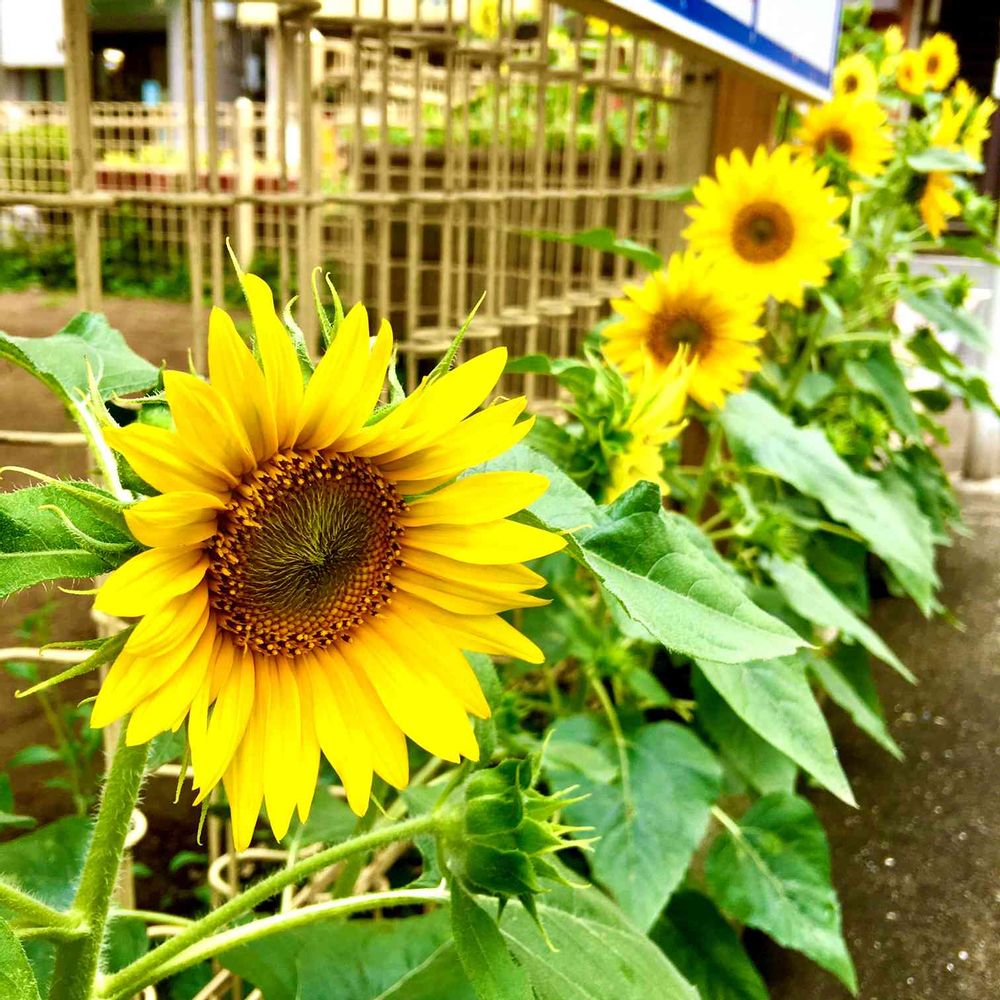 公園の低いフェンスに沿って植えられたミニ🌻🌻🌻🌻🌻は子供たちの背丈よりも小さく並んでいます