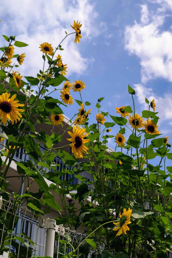 多花性の背の高いひまわりが、ずらっと取り囲んでいる。