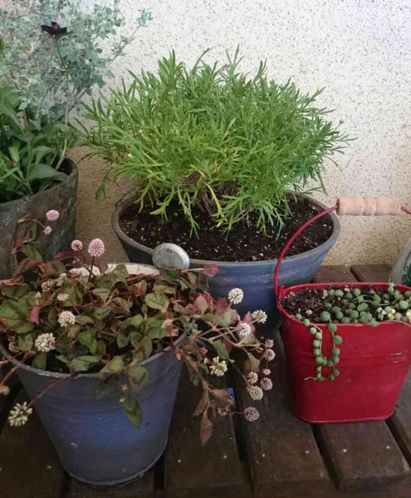 独立したマーガレット、脇から抜いたヒメツルソバ、そして赤いバケツには悩んで悩んで結局やっぱりグリーンネックレス(笑)