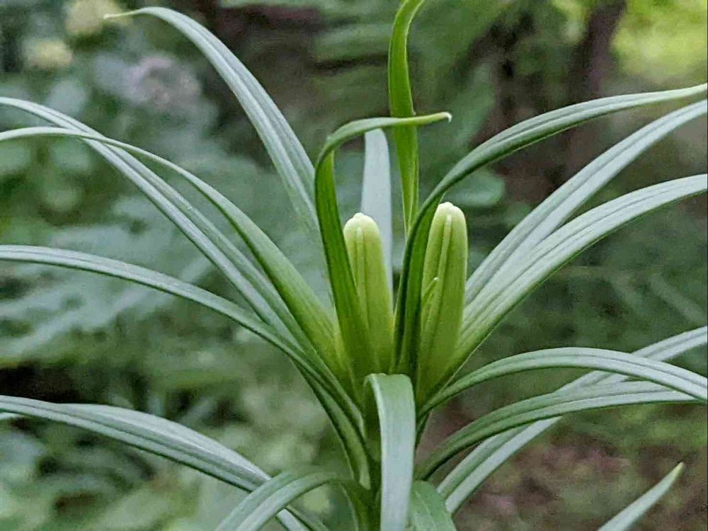 昨日斜面の"なんちゃって紫陽花ロード“に高砂百合?新鉄砲百合?…の可愛い蕾が二つ仲良く寄り添っていました