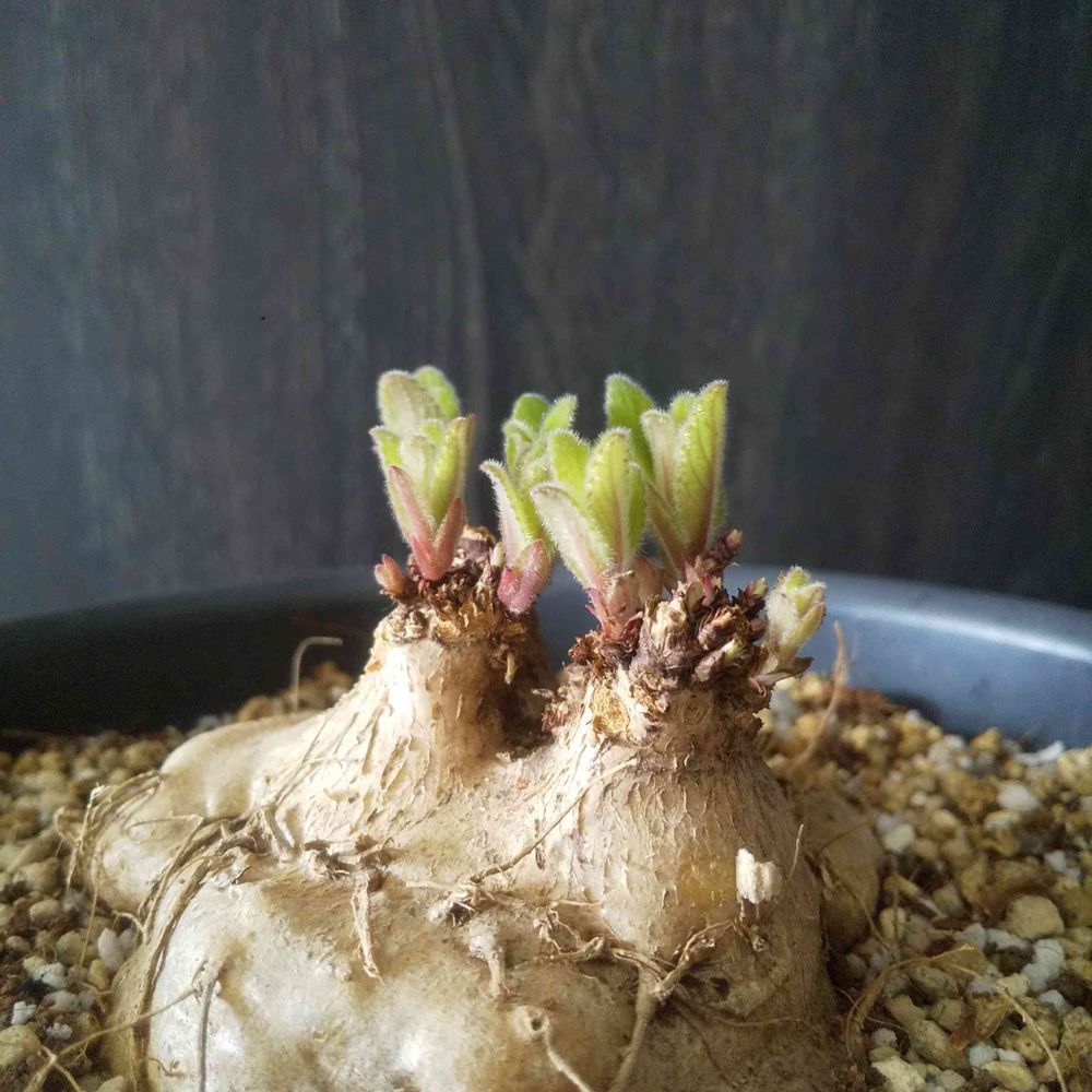 お持ち帰りして土から出して塊根を綺麗にして徒長した部分を全て取っ払い浅植えして様子を見てました。