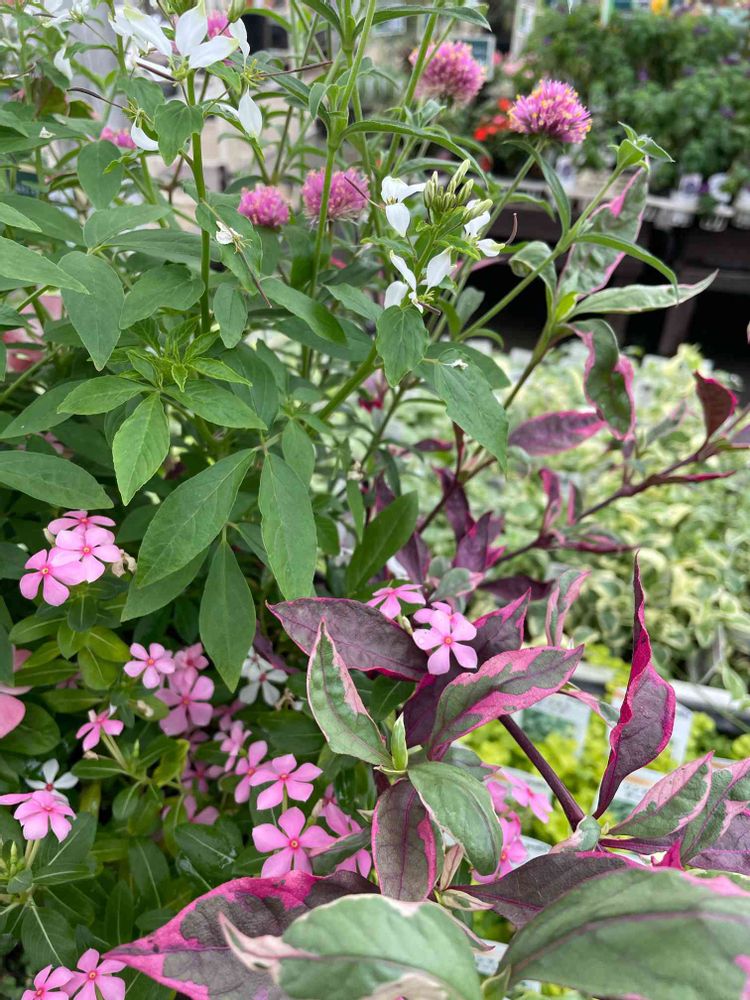 足元は、フェアリースターのピンクと白の2色植えと赤いカラーリーフ コタキナバルです🌿