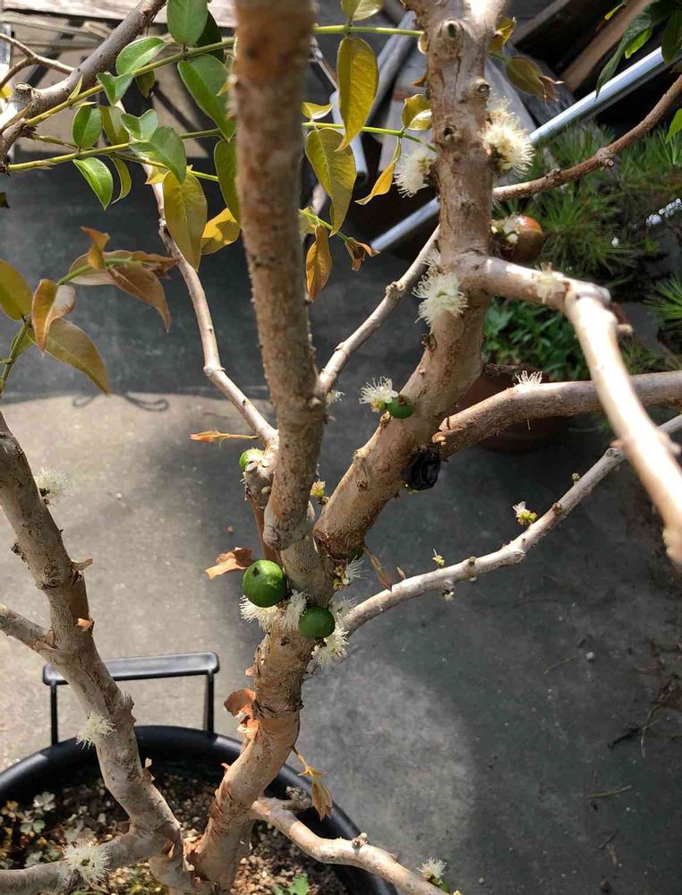 さん。7月中放っておいたジャポチカバは、葉っぱがしげりわさわさしていましたよ。一週間くらい前に枝の先だけ葉を残した状態にしました。幹から伸びた枝にも花が咲き出しました。