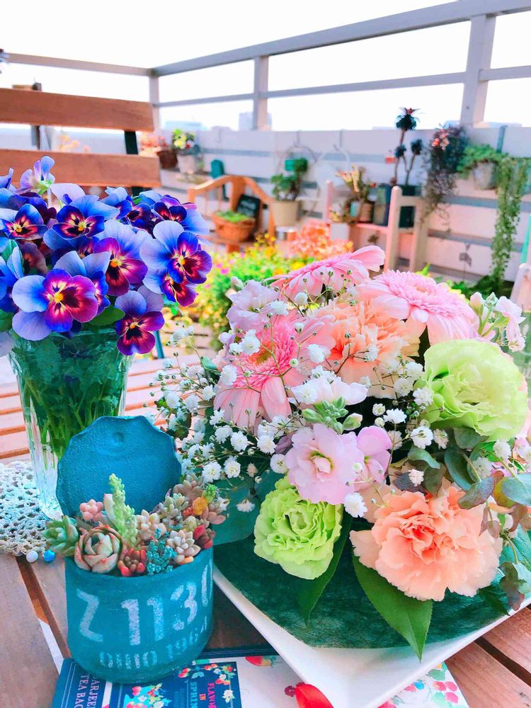 昨日、娘が友達の結婚式でもらってきたお花をオアシスに挿し、切り戻したビオラと一緒に飾りました〜(*ฅ́˘ฅ̀*)💓