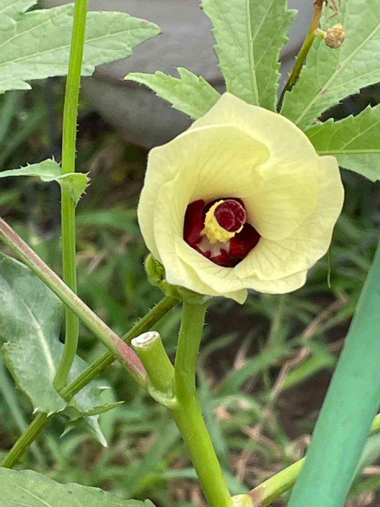 令和4年8月6日(土)☁️曇り☁️ おはよー^_^ございます 小さい庭で朝の見廻りしています。 広島に原爆が落とされてから77年 今朝もオクラの花🌼が咲きました。🙏