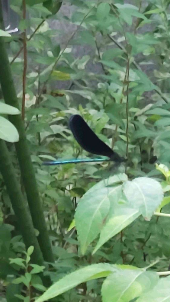 大人色のハグロトンボですが、胴が目立ってお派手なメタリックグリーンをしてるのが雄です👍