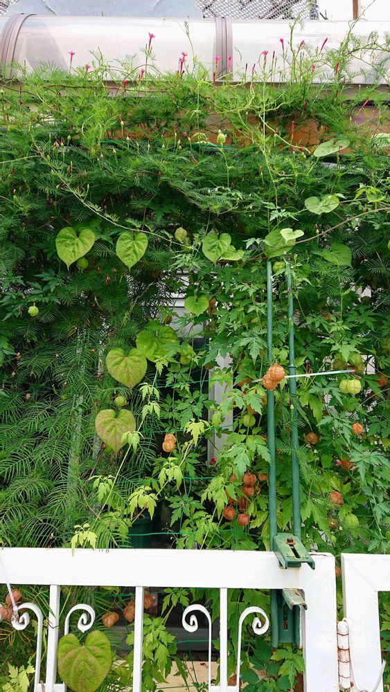 爽やかなグリーンの中に、オレンジ色の風船カズラとピンク色の可愛らしいルコウソウがアクセントになってすごく涼しげなグリーンカーテンになってますね✳️🧡✳️🧡✳️💕