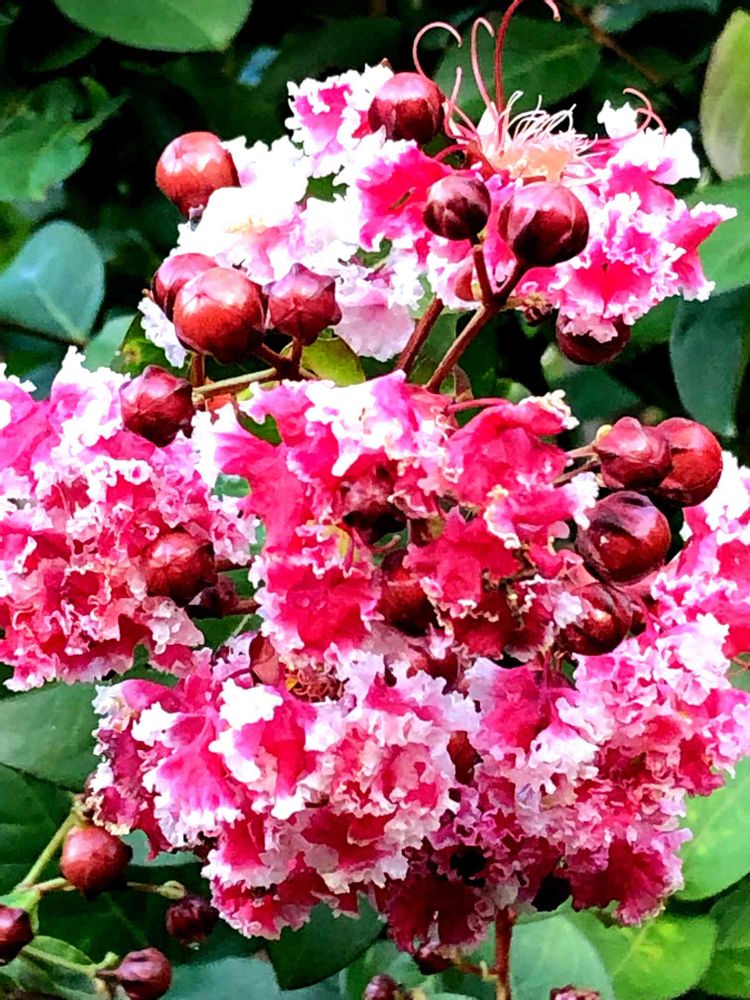 花弁が白く縁どりされた百日紅(サルスベリ)です。ペパーミントレース、別名夏祭りと言います。練乳のかかったイチゴのかき氷みたいです。