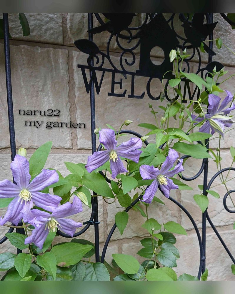 2番花のクレマチス、プリンスチャールズ、春より花が小さめだけど、たくさん蕾をつけてくれました💜