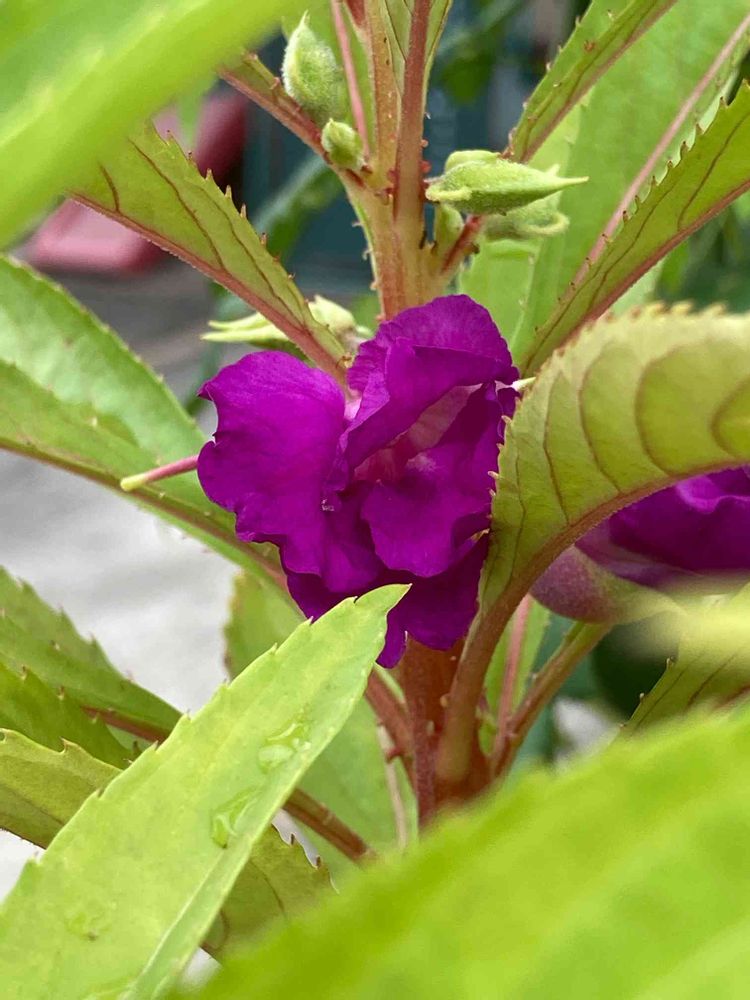 昨日に続き3種類目のホウセンカ、紫色が咲きました💜