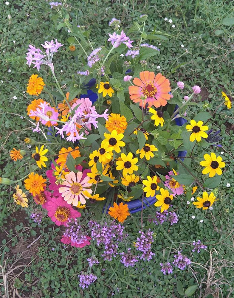 お墓参り用に畑の花を切って来ました。買ってきたカサブランカ(ユリ)と合わせます💐