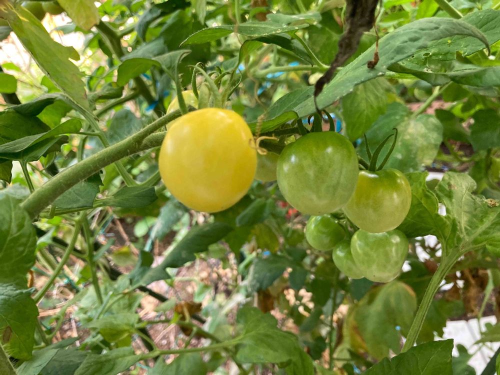 我が家の黄色のトマトは、楕円形で、赤色のより甘いです。橙色に完熟すると、より甘いです😋