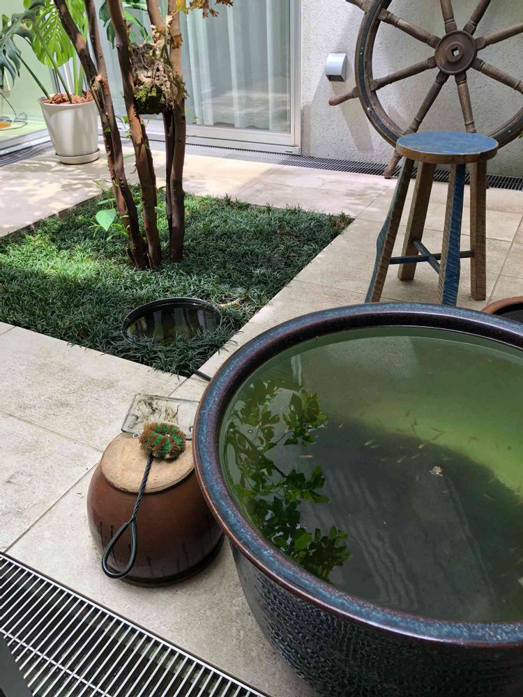 リュウノヒゲの植え込みには亀🐢さんの水がめが埋め込まれてあって、中庭空間はワカメ(←クサガメのオスなのにw)の居住区です。そういやワカメもここに来てもう4年目になるのかな。水遣りしてるとエサくれ!エサくれ!と足にまとわりついて来てカワイイですw(๑˃̵ᴗ˂̵)