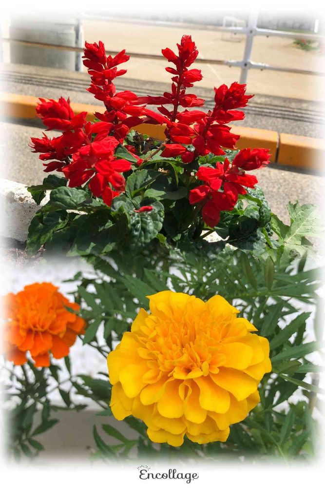 サルビアとマリーゴールドとても可愛い元気なお花💖😍素敵なコラージュ癒されます〜🍀