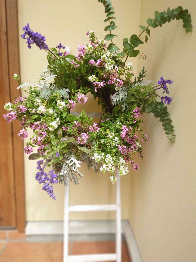 素晴らしいですね。寄せ植えなのですか?生花のリースかと思いました。あっ変な質問でしたかな?