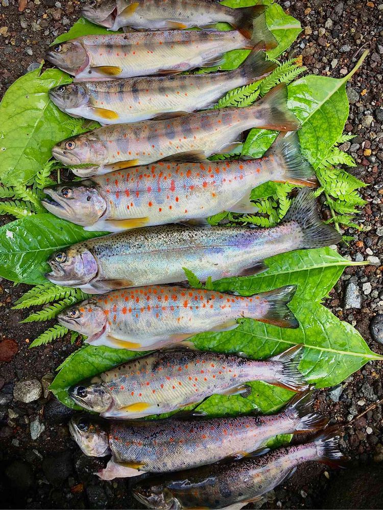 忘れた頃にコメントして済みません🙏🙇♂️🙏 久しぶりの釣りは、地元のよく行く沢に😊 未明に雨が降ったようで、早朝も小雨がぱらつく絶好のコンディション❣️ 最初の淵から入れ食い状態😍🙌暫くは、小物ばかりでリリースしてましたが、ニジマス(27cm中央の1尾)が釣れた辺りから、大物も混じるようになり、2時間半でこの釣果‼️😁🙌 嬉しかったのでアップしてしまいました😂 ニジマスを除いて全てアマゴです🥰 盆に甥姪が訪ねて来てバーベキューを楽しみにしているので、塩焼きを振る舞ってやろうかと思ってます‼️😊 皆様にお届けできないのが残念ですが…💦💦