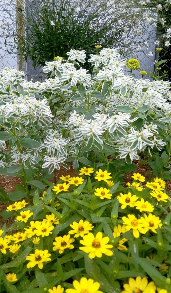 隣の空き地に種をまいたジニアと初雪草が暑いのに頑張って咲いています。
