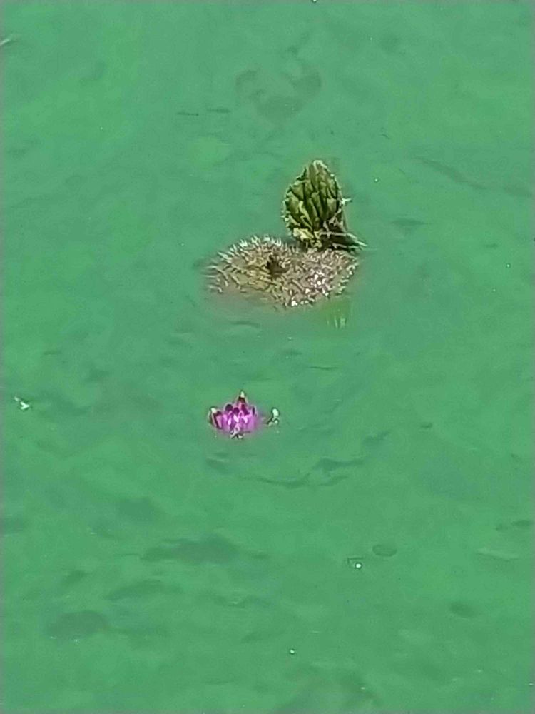 これ何?アオコの繁茂した池に咲く花、隣には若葉